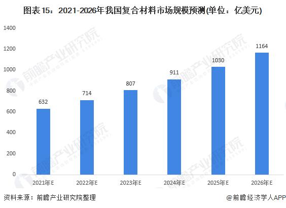 近年来,我国复合材料产量规模呈较高的增速增长,未来仍有较大的发展空间,“十四五”期间,我国大力推动环保、新能源汽车、电子消费品等行业的发展,对叶片等复合材料的需求不断高涨,同时,需要提高复合材料生产工艺以减少污染,未来复合材料价格或将迎来持续上涨周期。预计2026年我国复合材料市场规模将1164亿美元。