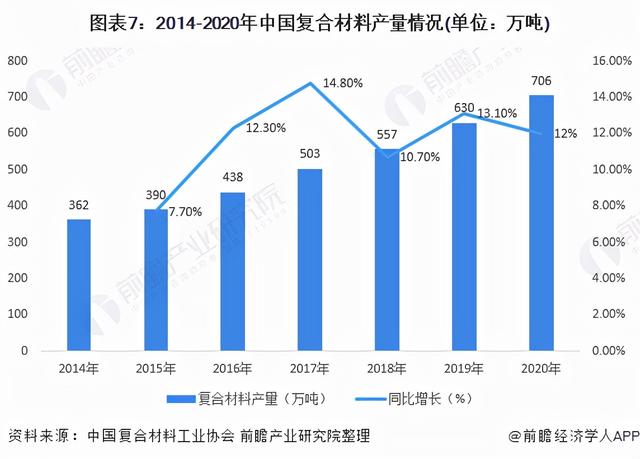 由于我国人均复合材料消费量低、市场空间大,近年来,复合材料行业的产量增速在12%左右,另外,我国复合材料产量在全球的占比也在不断提升。2020年,我国复合材料产量约超过700万吨。