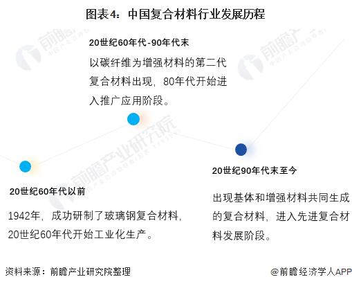复合材料使用的历史可以追溯到古代。从古至今沿用的稻草增强粘土和已使用上百年的钢筋混凝土均由两种材料复合而成。20世纪40年代,因航空工业的需要,发展了玻璃纤维增强塑料(俗称玻璃钢),从此出现了复合材料这一名称;随后,20世纪60年代又出现了以碳纤维为增强材料制成的复合材料,并在80年代得以推广使用;20世纪90年代末,复合材料行业才明确了基体材料和复合材料的组成方式,进入了如今的复合材料发展阶段,但至今为止,仍有较多材料等待挖掘,未来潜力巨大。