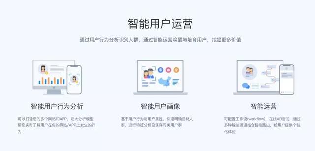 智能用户运营解决方案在用户与我们交互的全流程里在底层起着智能化的作用,让我们把用户运营做得更高效,智能用户运营解决方案需要两个产品支持,分别是智能分析和智能运营。