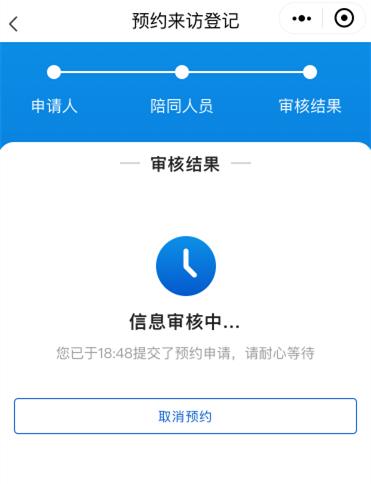 当事人或律师提交后可在预约进度页面查看审核结果,如预约成功,会提示预约号等相关信息,如预约时段已满,会提示预约已满,可以重新调整时间进行预约。在该页面中也可点击【取消预约】按钮来取消预约。