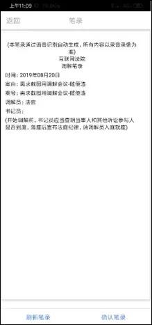 在庭审过程中,和PC客户端一样,能实时查看庭审笔录,庭审结束后,法官发起在线的笔录签字,当事人确认无误后进行笔录签字。在整个庭审过程中,可以点击“刷新”按钮,实时查看庭审笔录。