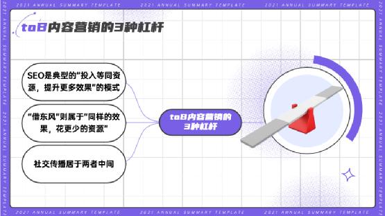 对toB内容营销来说,有且只有三种核心的杠杆模式,分别是SEO、社交传播和“借东风”。其中,SEO是典型的“投入等同资源,提升更多效果”的模式,“借东风”则属于“同样的效果,花更少的资源”,社交传播居于两者中间。