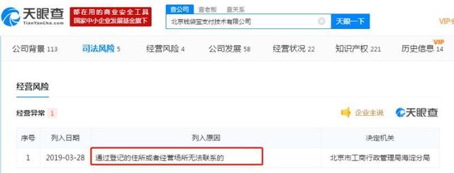 铅笔道4月2日讯,天眼查数据显示,3月28日,钱袋宝运营主体北京钱袋宝支付技术有限公司因通过登记的住所或者经营场所无法联系,被北京市工商行政管理局海淀分局列入经营异常名录。