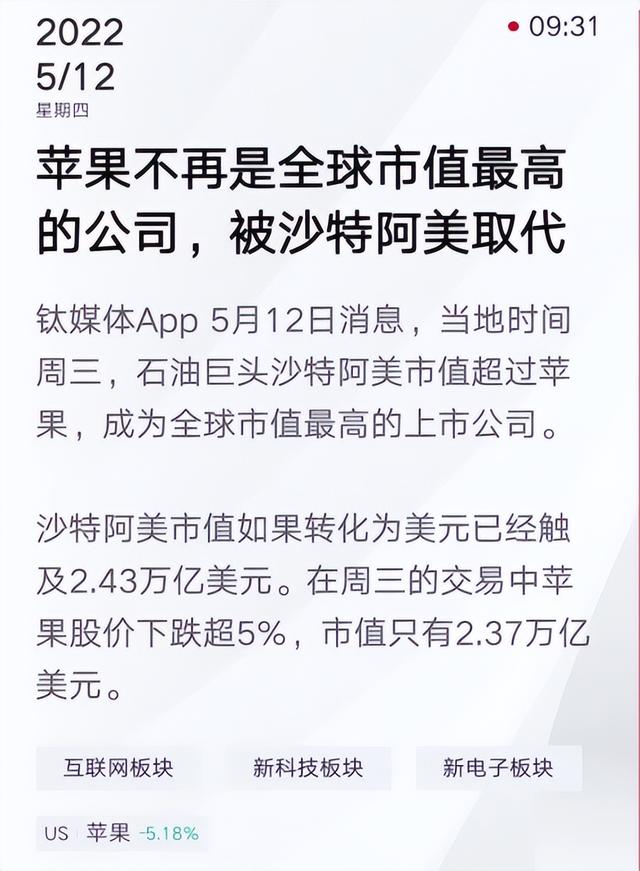 当年苹果的全球最大市值公司就是从沙特阿美手上“抢”来的。