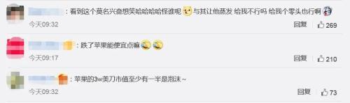 有网友称,“整个美国的股市都在下跌,苹果股市下跌意料之中啊”,还有网友调侃:“与其让它蒸发,给我个零头也行啊”。