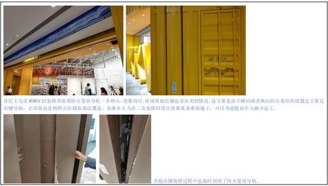 8.首层主力店KIKV的装修界面将防火卷帘导轨一并纳入,效果尚可,商场其他店铺也存在类似情况。这主要是由于横向或者纵向防火卷帘的设置过于靠近店铺导致,正常情况是按照公区精装做法覆盖,如果在主力店二次装修时设计效果要求重新施工,可以考虑提前介入减少返工。
