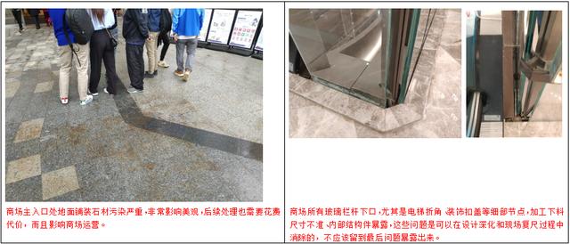 2.商场所有玻璃栏杆下口,尤其是电梯折角、装饰扣盖等细部节点,加工下料尺寸不准、内部结构件暴露,这些问题是可以在设计深化和现场复尺过程中消除的,不应该留到最后问题暴露出来。