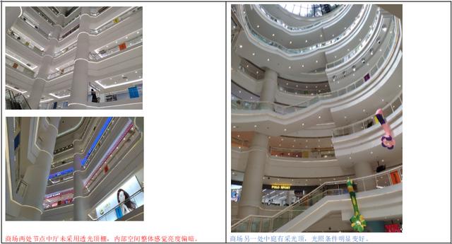 商场两处节点中厅未采用透光顶棚,内部空间整体感觉亮度偏暗。
