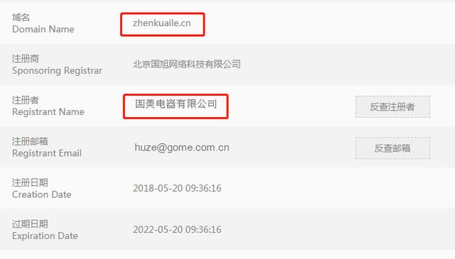 据Whois查询发现,zhenkuaile.cn已经被国美电器有限公司收购。而zhenkuaile.com的注册信息虽然处于隐私保护状态,但深入查询域名可以发现,该域名是在12月8日完成的交易,与zhenkuaile.cn都在2020年12月29日19:54的前后几十秒内有过更新记录,并且两个域名都是在同一个注册商平台。