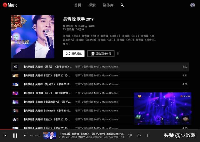 YouTube Music 最大的特色在于用户可以自行上传音乐,创建专属的音乐网盘和歌单。你甚至可以将这些歌曲分享出去,让别的用户也能收听。同时,你也能搜到那些 YouTube 上的音乐视频。举例来说,当你在 YouTube Music 搜索「吴青峰」时,就能找到其他用户将他 2019 年在《歌手》节目中的所有 Live 做成的歌单。