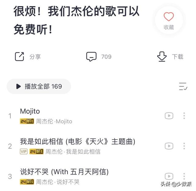 网易云音乐在坚持维护「云村」社交氛围的同时,这几年也陆续拿下了不少版权,比如吴青峰的《起风了》就无法在 QQ 音乐上找到。咪咕音乐作为新入局的平台,则选择了剑走偏锋,凭借着最高 24bit 音质和「免费听周杰伦」吸引了不少用户。
