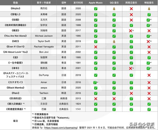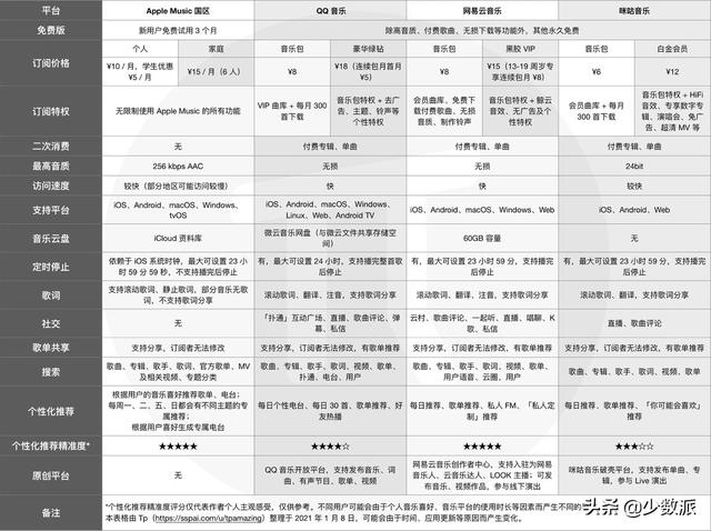 结语总的来看,QQ 音乐和 Apple Music、Spotify 和 YouTube Music 是综合表现最好的平台。