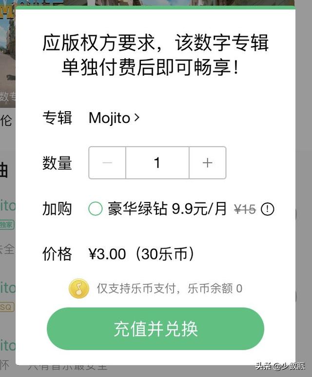 我个人认为,QQ 音乐稍显遗憾的一点在于它的二次付费项目。即使你订阅了音乐包或豪华绿钻,部分歌曲 / 专辑依然需要额外付费才能收听或下载。此外,原先在 QQ 音乐中的「购买单曲」功能也在后续的更新中被藏了起来,对于听歌需求不高,只想买几首歌的用户来说,并不算一个好消息。