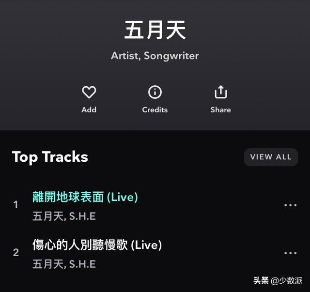 此外,Tidal 的中文歌资源并不多。以五月天为例,你只能在 Tidal 上找到两首与 S.H.E 合唱的 Live 版。如果你用「Mayday」来搜索,甚至连五月天都找不到。