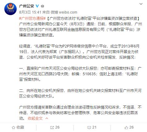 8月3日,广州市公安局通过官方微博“广州公安”发布通报称,根据群众举报,广州警方已依法对广州礼德互联网金融信息服务有限公司(“礼德财富”平台)涉嫌集资诈骗立案侦查。