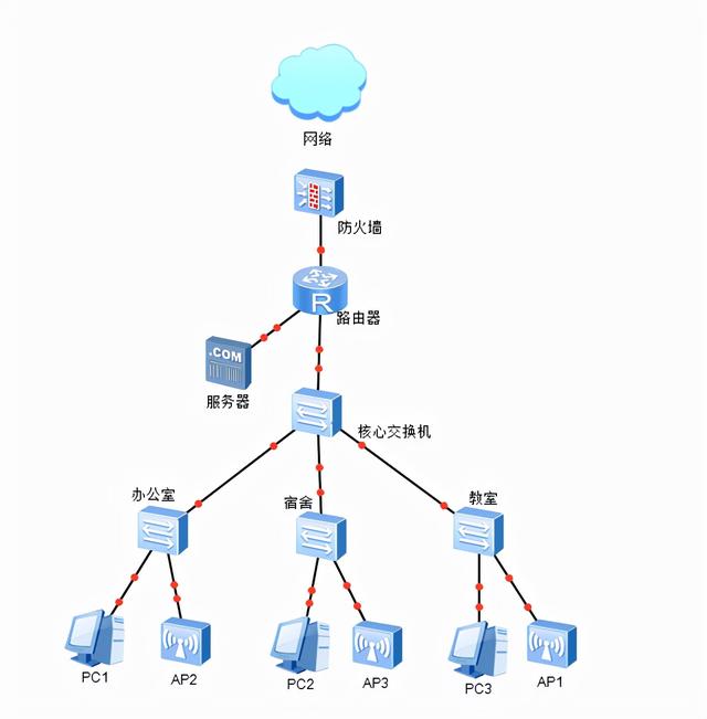 外网--防火墙--爱快路由--服务器和爱快核心交换机--爱快核心交换机下接办公室网络、宿舍网络、教室网络--电脑、无线。