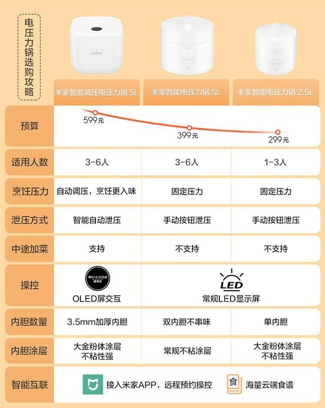 目前小米拥有3款电压力锅和5款电饭煲。产品线可以说是相当丰富。电压力锅就不用说了,绝对是越大越好,买那个2.5升的没准连猪肘都放不进去,剩下两个5升容量款主要区别在于能否自动调压、智能调压款可以做到中途加菜,做出的炖肉更入味。两款同样支持接入米家app,不过普通5升款送两个内胆,按需购买即可。这里我选了智能调压款。