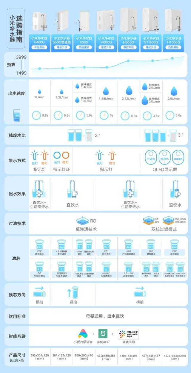现代家居当中净水机也是十分重要,小编曾经算过一笔账,使用净水机净化自来水三年成本比买桶装水更便宜。目前小米在售的净水机产品可谓是琳琅满目。我个人的购买建议是在保证流量够用的前提下挑便宜的买。