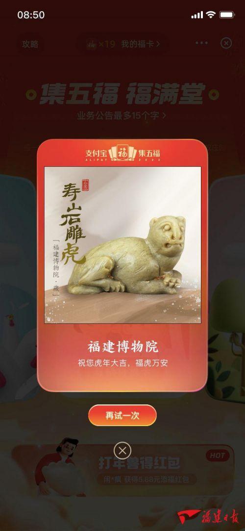 东南网1月18日讯(福建日报·新福建客户端记者 林侃 文/图)19日0时,2022年支付宝“集五福”将正式开启。福建博物院携特色“虎文物”首次参与五福活动,喜迎虎年。