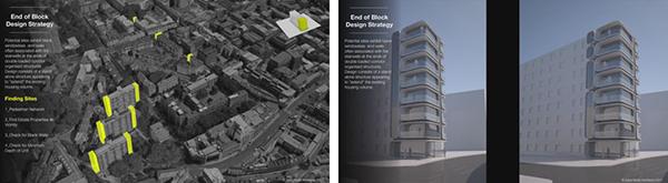 住宅楼端头扩建策略:潜在地点是现有住宅的无窗端头空地处,通常在双边走廊式建筑(double loaded corridor organized structure)中,两端会设置消防楼梯。扩建住宅为一栋独立建筑,但其外观却如同现有住宅楼的延伸。