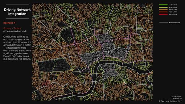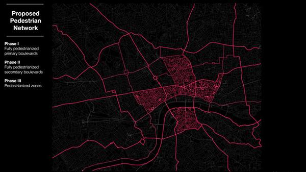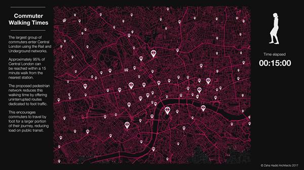 扎哈·哈迪德建筑事务所提出的伦敦步行化方案,逐步转变为由步行道路连通的城市。拟建步行体系分三阶段实现:阶段I,主要大道完全步行化;阶段II,次级道路完全步行化;阶段III,区域步行化的实现。