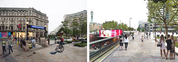 牛津广场步行化改造效果示意(左图),优斯顿下穿道周边区域步行化改造效果示意(右图)