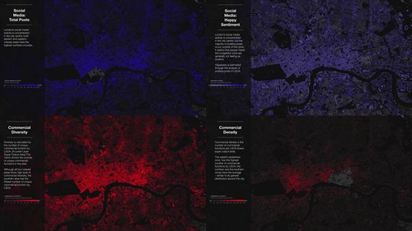 根据以上数据,“宜步行伦敦”项目借助Habidatum软件工具完成了区域步行化水平与人和商业活动相关性的数据分析、情景分析与可视化呈现。对人和商业活动评测的四个指标为:社交媒体的点评数量;社交媒体呈现的快乐情绪;商业多样性;商业密度。