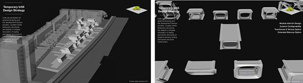 临时性填入住宅设计策略:潜在地点为废弃建筑、低密度停车场以及利用率低下的庞大景观场地。可使用灵活多样的模块化建筑设计,由外部阶梯进入住宅单元。建造在适合临时建筑或者在有待更新的永久性建筑附近,施工期间可供居民租住。
