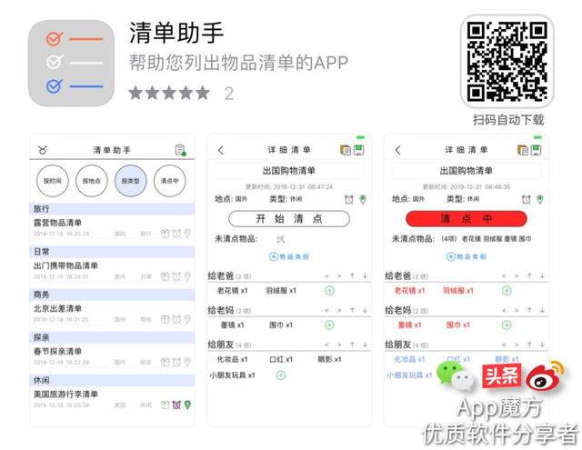 ● 简介:「清单助手」一款可以帮助您列出物品清单的APP。当您在旅行、出差、探亲时,帮助您建立一份物品清单,避免遗漏。 清单建立后,可使用清点按钮,开始一一核对。