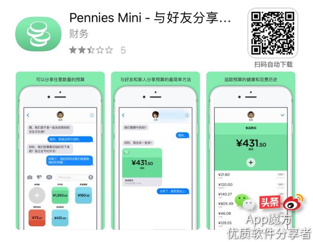● 简介:「Pennies Mini」是一款曾获苹果全球“编辑选择奖”的App,此软件可以扩展苹果官方iMessage的功能,让您可以通过iMessage快速创建分享你的预算。