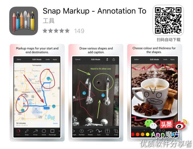 ● 简介:「Snap Markup」是一款专业的图片快速标注、批注工具。软件支持箭头、方框、圆圈、直线、曲线等多种方式快速标注。