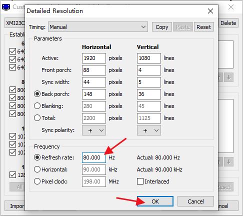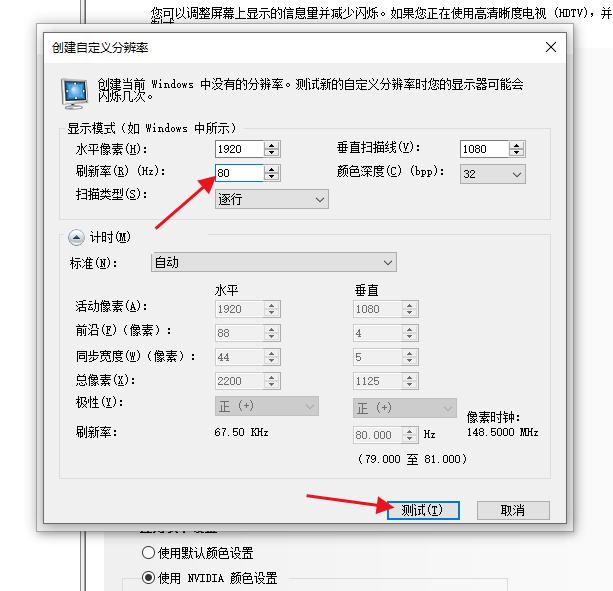 将弹出窗口的刷新率一栏的数值改成你想要超频的数值,(小米显示器可以支持超频到80Hz,这里我就设置的80)其他显示器建议多试几个数值慢慢上去尝试一下,选好之后点测试,系统会黑屏1-3秒之后重启亮起,如果黑屏不亮的话,证明显示器不支持该刷新率,需要降低一下刷新率数值。