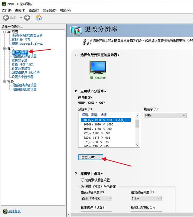 在驱动界面中找到更改分辨率,点击自定义的选项: