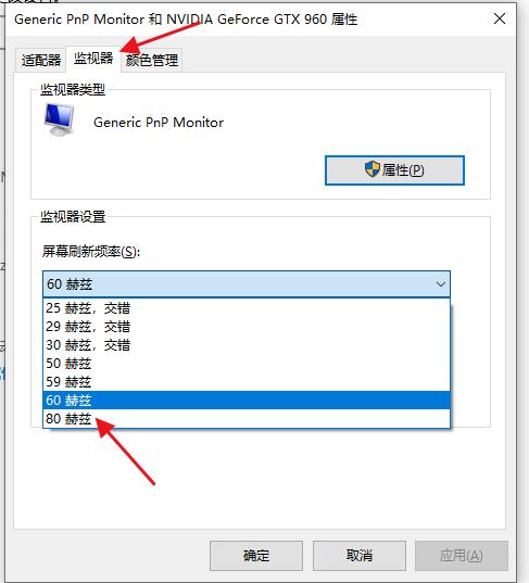 在弹出的窗口中选择监视器,调节屏幕刷新率到80Hz(你设置的刷新率)就可以了。然后点确定就超频完成了。