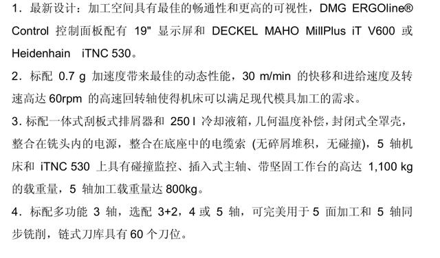 配置 Heidenhain(海德汉) iTNC 530 系统。该系统是面向车间应用的轮廓加工数控系统,操作人员可以在机床上采用易用的对话格式编程语言编写常规加工程序。它适用于铣床、钻床、镗床和加工中心。iTNC 530 最多可控制 12 个轴。