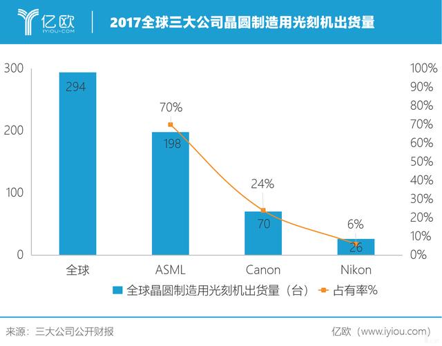 根据三家公司17年财报显示,2017年全球晶圆制造用光刻机台出货294台,其中ASML就出货198台,占全球近7成的市场。其中EUV光刻机11台,ArFi光刻机76台,ArF光刻机14台,KrF光刻机71台,i-line光刻机26台。
