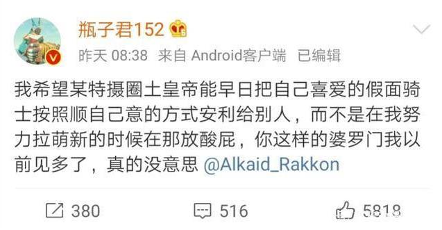 一向脾气暴躁的瓶皇见到七只海獭炮轰自己,立刻予以还击。瓶子君嘲讽七只海獭为“特摄土皇帝”,还嘲讽海獭为“特摄婆罗门”,在自己拉萌新的时候“放酸屁”。两个大佬一搅和,双方的粉丝立刻加入战场。七只海獭的粉丝多来自于特摄圈,主要是《假面骑士》粉,瓶子君的粉丝则来自动漫圈,多来自喜欢看吐槽杂谈的漫迷。“瓶獭之战”是少有的不因为作品争议,单纯由圈内大佬搞起的论战,这场论战最后由瓶子君缄口七只海獭停火告终。同时它又向我们抛出一个问题:对特摄圈子不了解的动漫迷,或者对动漫圈子不熟悉的特摄迷,能不能在对方的圈子都取得一定的话语权呢?对于这个问题思考延续至今。