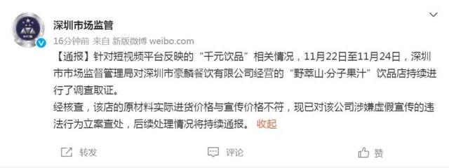 11月26日,深圳市市场监督管理局官方微博发布通报称,针对短视频平台反映的“千元饮品”相关情况,11月22日至11月24日,深圳市市场监督管理局对深圳市豪麟餐饮有限公司经营的“野萃山·分子果汁”饮品店持续进行了调查取证。
