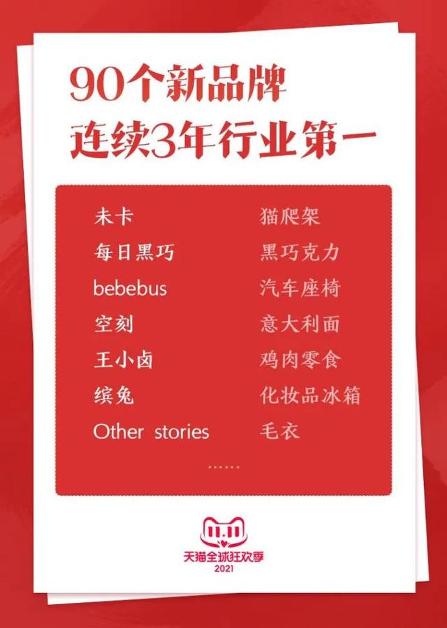 2021年11月12日零点,天猫双11总交易额定格在5403亿。开售第一小时,超过2600个品牌成交额超过去年首日全天;截至11月11日23时,698个中小品牌的成交额实现从百万级到千万级的跨越;78个去年双11成交额千万级的品牌,今年双11成交额突破了1亿元大关。去年天猫有360个新品牌成为行业第一,今年行业第一的清单上品牌增加了2倍以上,其中,双11第一波期间,未卡、每日黑巧、缤兔、Other stories等90个品牌,连续3年持续“霸榜”,蝉联细分行业第一。