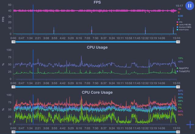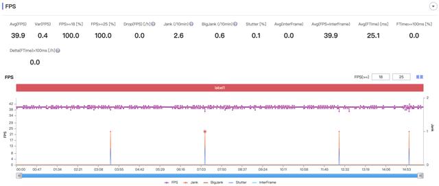 紧接着是对配置略有要求的《和平精英》,在该游戏中,我们选择了流畅画质 + 超高帧率(40 帧),在 15 分钟的游戏中,帧率基本也是区域稳定状态。