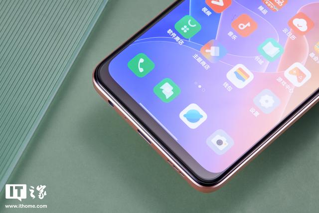和“惊艳”的背面设计相比,OPPO A96 的正脸看起来就中规中矩了,6.43 英寸的 OLED 打孔屏,孔内是 1600 万前置镜头。屏幕上、左右边框控制的还不错,但下巴确实有些明显了些,整体屏占比 90.8%。