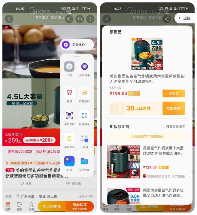 商品比价也非常重要,购买一些大件商品时,不同的商家、不同的时间往往会有不同的价格,担心自己买贵?通过智能侧边栏 2.0,呼出商品比价选项,帮助你找到物美价廉的那一款,同时也提供了领券选项。