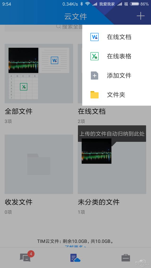 所谓云文件,没有在线存储空间怎么行?TIM 2.0为用户准备了10G的免费云盘空间,用户可在线直接创建文档到云盘空间,也可以上传本地文件到云盘。