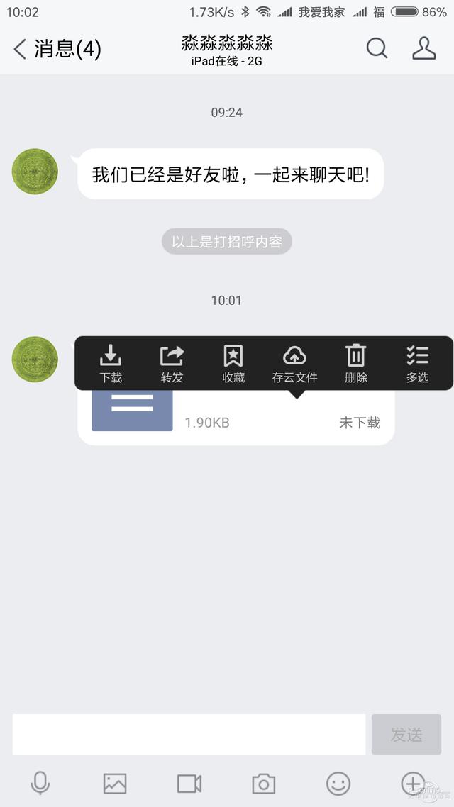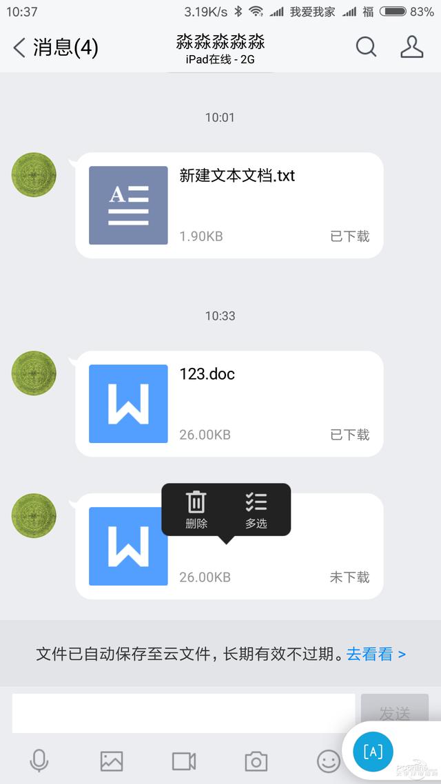 此外,用户可以直接将云文件里的文件发送给好友,用户可以在云文件中查看到某个文件在什么时候发送过给那个好友。不过仅限于QQ好友,不能以链接形式发送文件,也就是不支持外链。还有就是,位于云文件里的文档可以直接进行打开操作,但是却不能进行编辑操作。