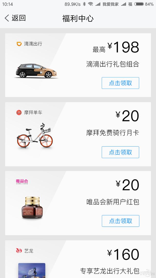 TIM 2.0新增了福利中心,福利中心将不定期的为用户提供不同的专属福利内容,比如目前就有滴滴出行、摩拜单车、美团外卖、手机充值等的福利内容。