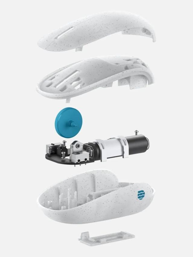 鼠标外壳的材质是20%海洋回收塑料熔炼成的高质量聚合物,来自于合作机构 SABIC(沙特基础工业公司)在海洋中回收的各种塑料垃圾,包括并不限于塑料瓶、衣物纤维等。