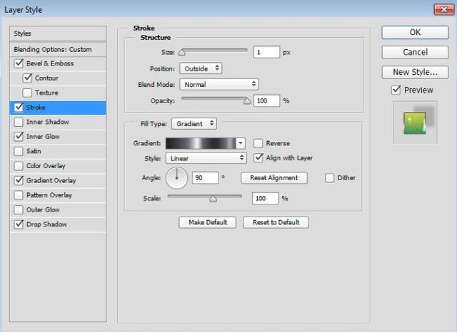 在样式列表中单击“笔触”。将大小设置为1像素。将填充类型更改为渐变并将角度设置为90°。现在点击渐变缩略图打开渐变编辑器。单击右侧的加载按钮,导航到Photoshop下载的渐变形状,找到CHROMES.grd文件,然后单击打开。渐变将被添加到列表的底部。选择不锈钢10x渐变,然后单击确定关闭渐变编辑器。