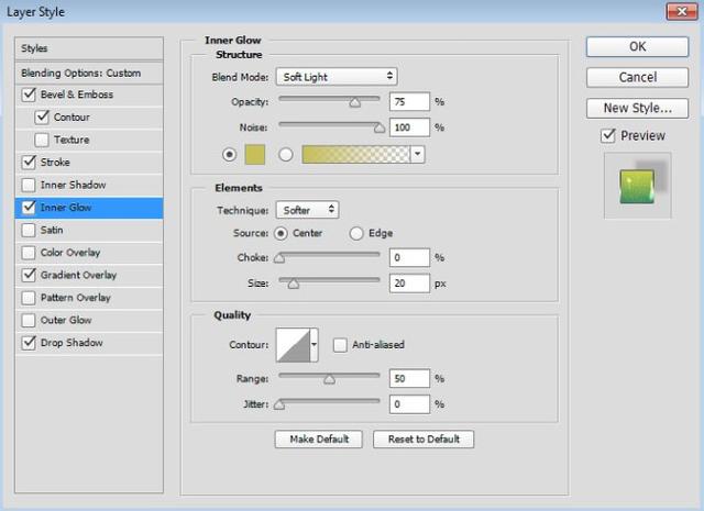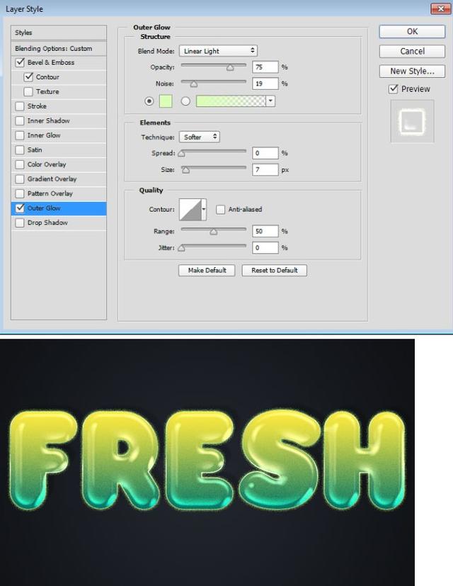 从样式列表中选择外发光。将混合模式更改为线性光源并将噪点设置为19%。单击黄色色板,为颜色选择#dbffb7,单击确定关闭颜色选择器,并将大小更改为7像素。单击确定以应用图层样式。这增加了最后一个光面图层,以及一个外部发光,使效果看起来更有趣。