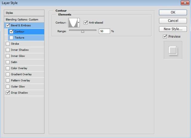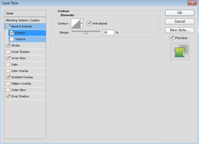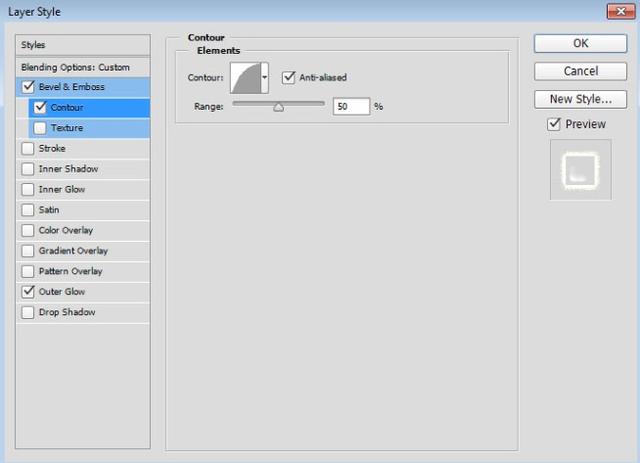 在样式列表中单击轮廓。单击Contour缩略图旁边向下的箭头,选择Half Round,然后选中Anti-aliased框